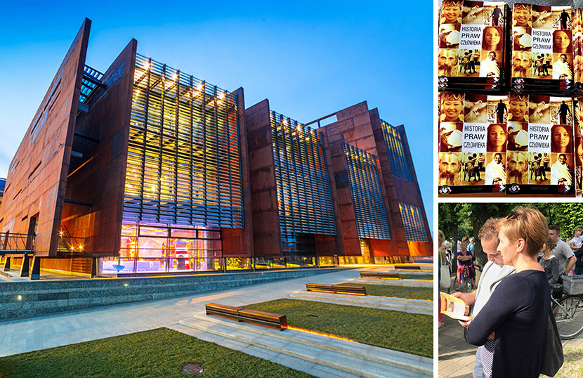 Het Europese Solidariteit Centrum in Polen (boven), het Poolse boekje Het Verhaal over Mensenrechten (rechts bovenaan) en plaatselijke bewoners met het boekje in Polen (rechts onderaan).