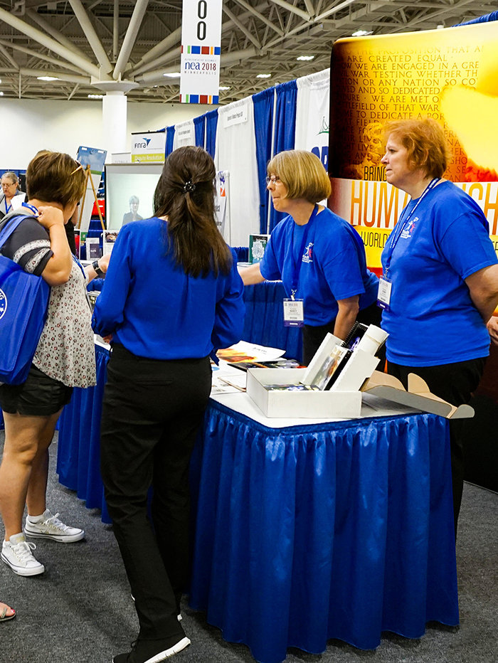 Daarom stellen Verenigd voor de Mensenrechten (United for Human Rights, UHR) en Jongeren voor Mensenrechten, gratis materialen voor ze beschikbaar op jaarlijkse NEA-conferenties. Dat was dit jaar niet anders, met een UHR-informatiestand op de 156e jaarlijkse NEA-bijeenkomst die in het Minneapolis Conventiecentrum in Minnesota werd gehouden.