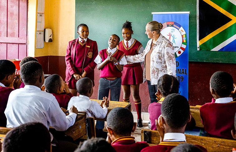 Het begon in Zuid-Afrika waar koning Thomas Edgar Brown van het Nationale Khoisan Koninkrijk het team verwelkomde. Professoren van universiteiten, religieuze leiders, politieagenten, NGO’s en de gemeenschap kwamen samen voor twee conferenties over mensenrechtenonderwijs. Daarna werden er workshops gegeven in scholen in Alexandria en Soweto.