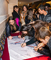 Kunst en Cultuur voor Mensenrechten in Italië organiseerde een evenement in de Italiaanse Kamer van Afgevaardigden – een van de vele educatieve activiteiten waarvoor de groep beloond werd met de Human Rights Hero Award. Duizenden jongeren (boven, rechts) tekenden mensenrechtenvlaggen die alpinist Daniele Nardi (boven, rechts) daarna naar de hoogste bergen nam.