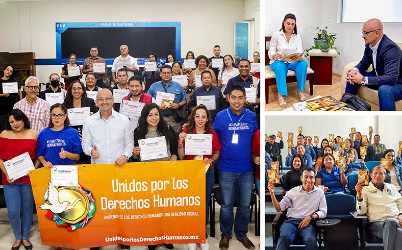 Manuel de Jesús Paredes González, een docent uit Aguascalientes, Mexico, rust scholieren en ambtenaren uit om de mensenrechten te respecteren.